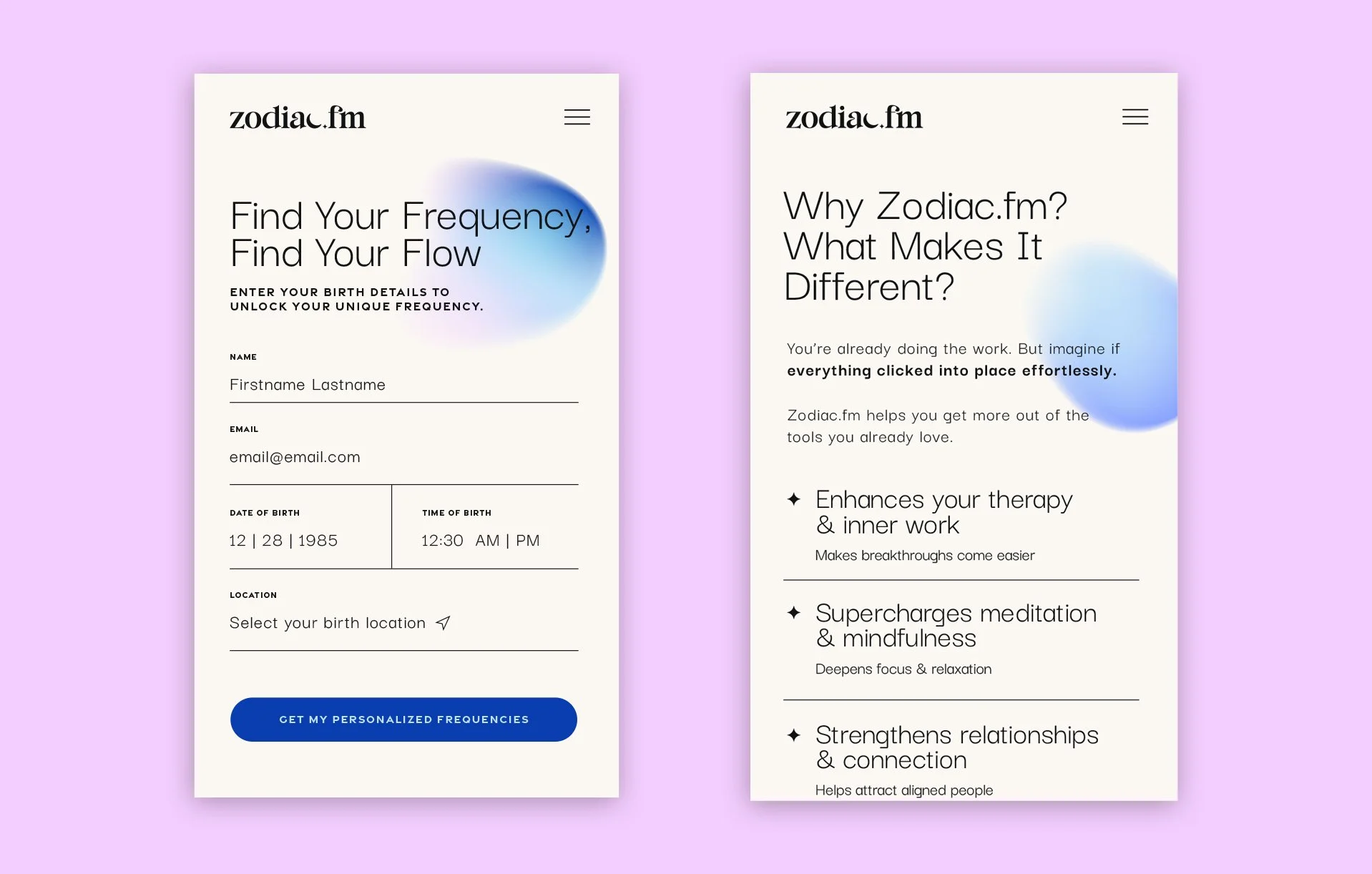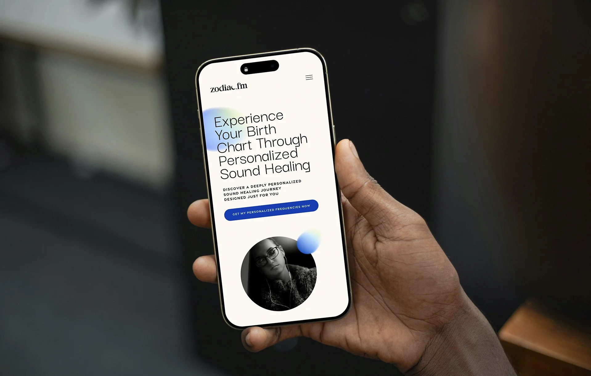 Zodiac.fm transforms birth charts into immersive soundscapes, turning astrology into a deeply personal frequency you can feel and hear. My work, designed at Myosin, brought this vision to life through a bold new brand identity—logo, color palette, and visual system—paired with app and landing page design that balances cosmic wonder with modern usability. The result is an experience that feels both otherworldly and grounded, inviting users to step into their own unique resonance.